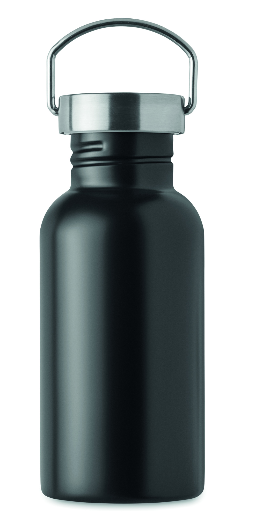 Single wall bottle in recycled stainless steel (90 % recycled stainless steel and 10% stainless steel) with lid and handle. Leak-free. Capacity: 500 ml.