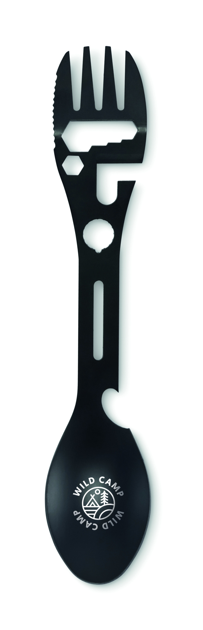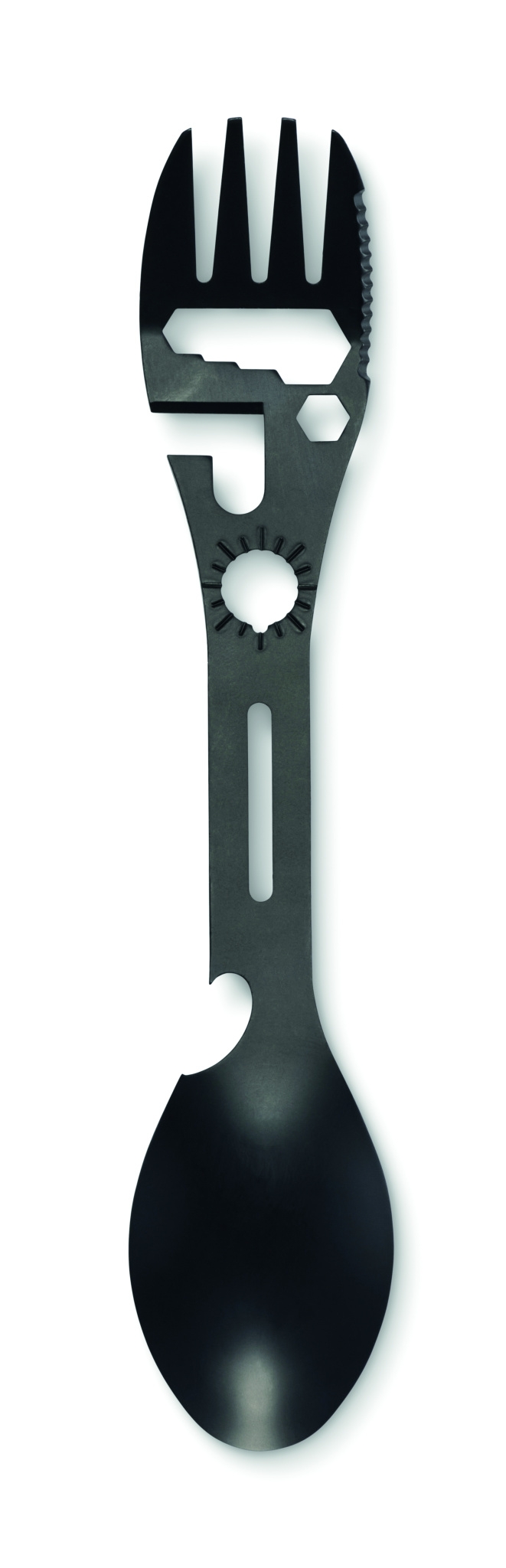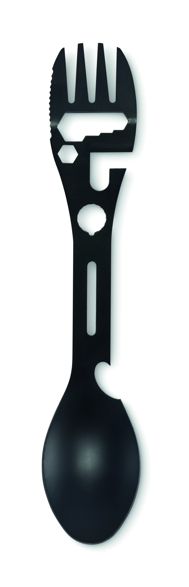 Stainless steel multi tool cutlery. Tools includes spoon, fork, adjustable wrench, bottle opener, hex key, serrated knife, opener and positioning wrench.