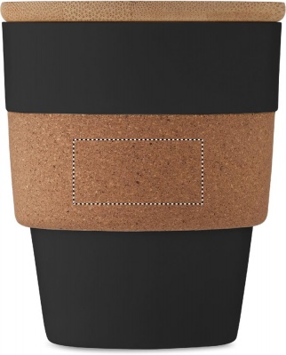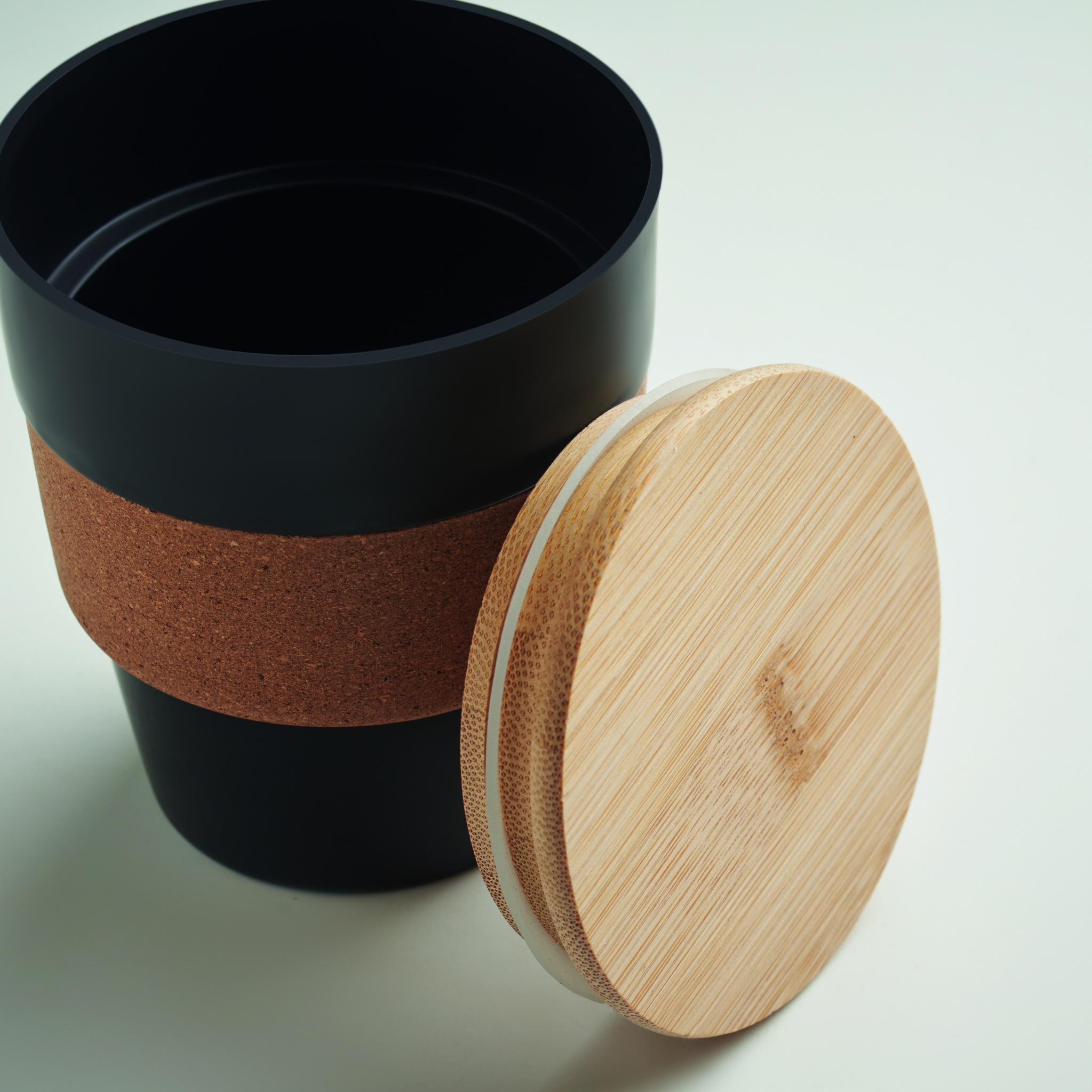 Одностенный стакан из переработанного полипропилена с пробковой защитной вставкой и бамбуковой крышкой. Объем: 300 мл. Возможна частичная теплопередача.