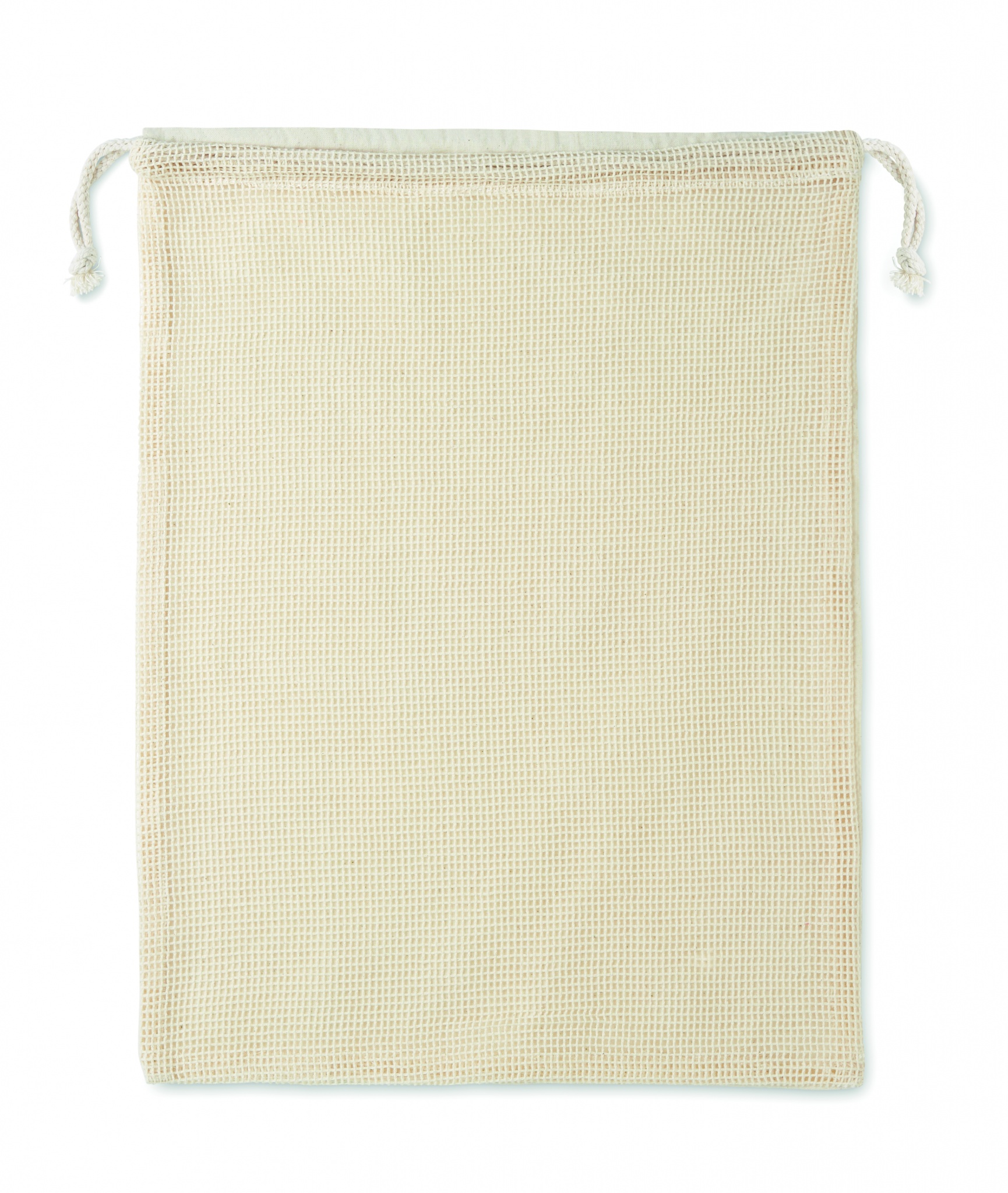 Сумка многоразовая. Одна сторона из хлопка (140 г / м²), а другая - из сетки (110 г / м²). Стягивается кулиской.