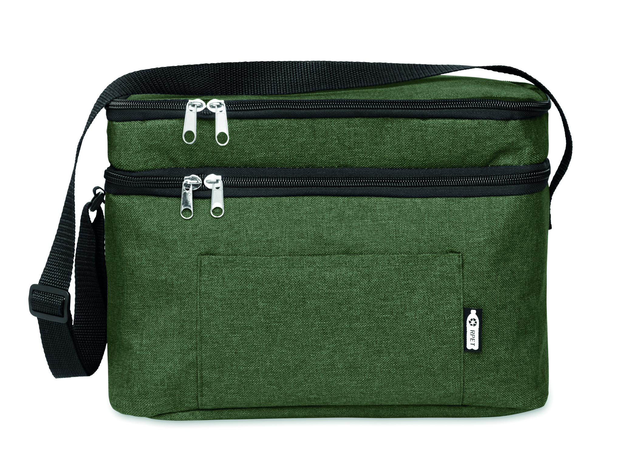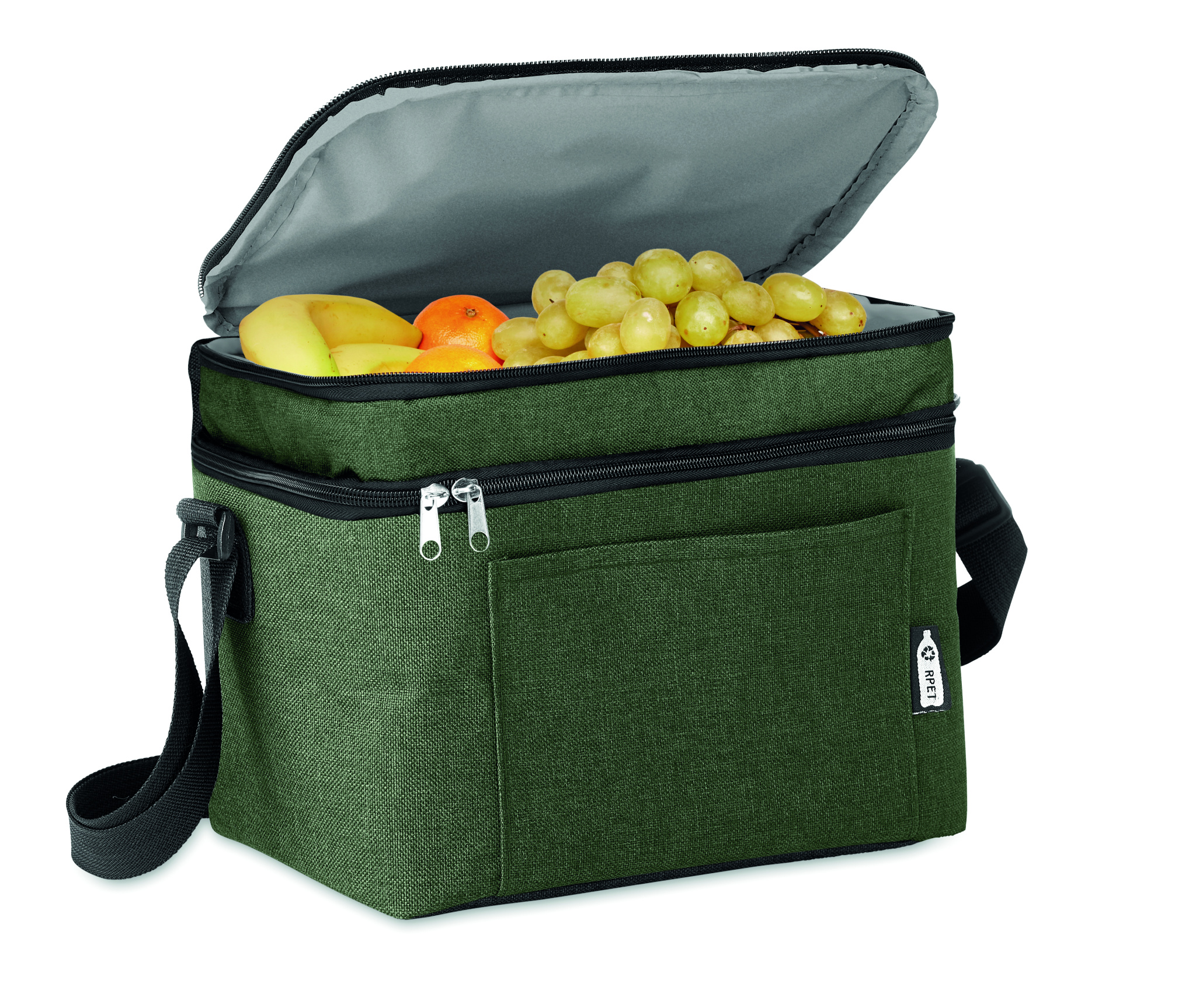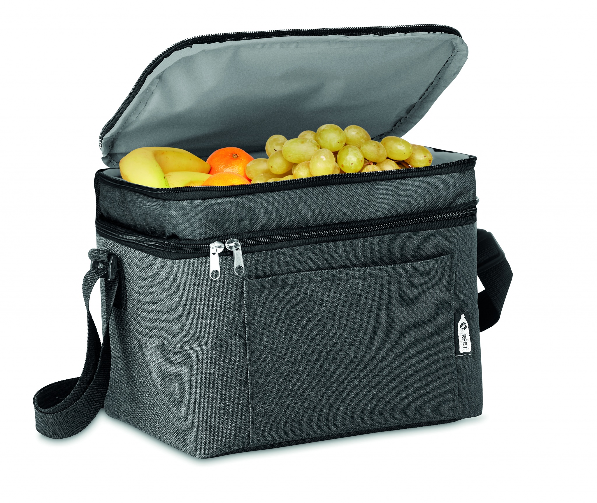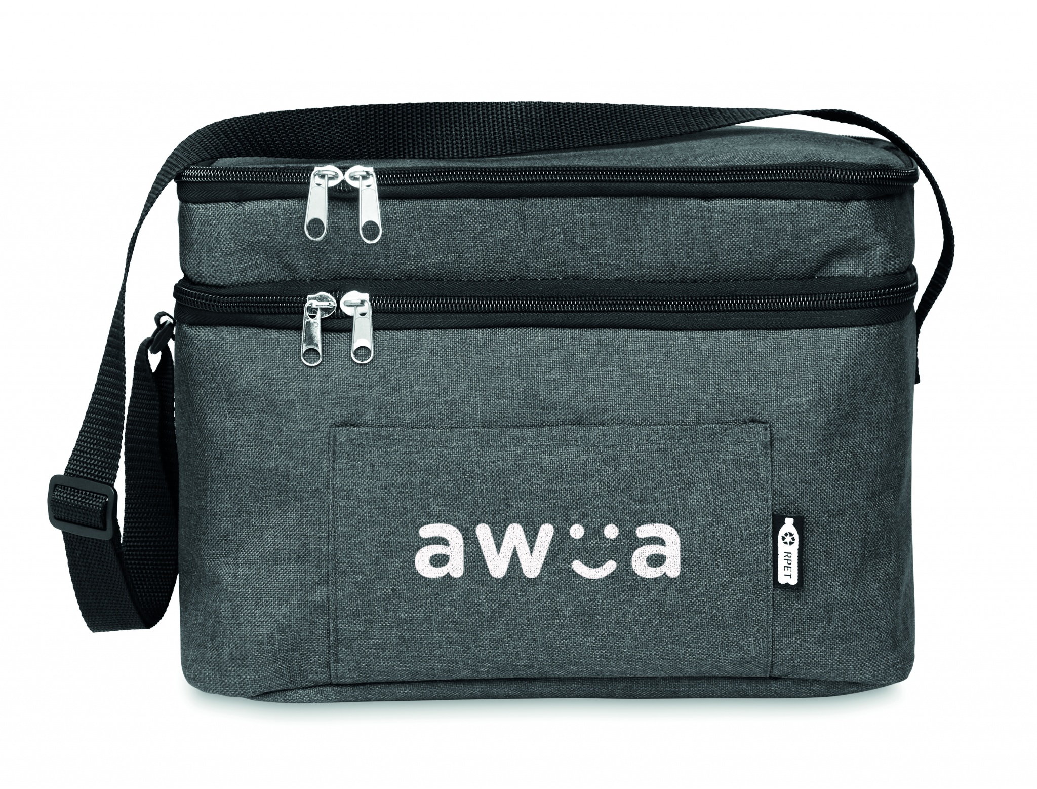 Двухцветная сумка холодильник из RPET 600D с 2 отделениями и подкладкой из PEVA. Регулируемый плечевой ремень и передний карман.