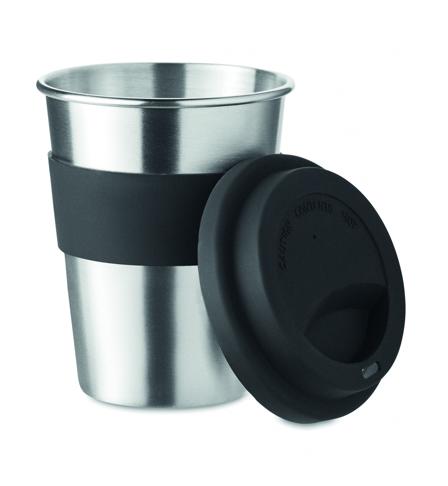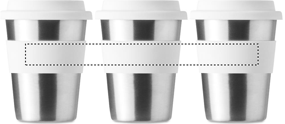 Стакан одностенчатый из нержавеющей стали с силиконовой крышкой и поясом. Емкость 350 мл. Поскольку это одностенчатая кружка, стакан может нагреваться.