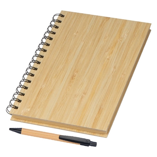 Шикарный эко-набор, состоящий из блокнота формата DIN A5 с бамбуковой обложкой, спиральным переплетом и 160 линованными страницами из переработанной бумаги, а также бамбуковой шариковой ручки с синим пластиковым стержнем и пластиковыми аппликациями. Мы выгравируем ваш логотип на внешней стороне обложки блокнота.