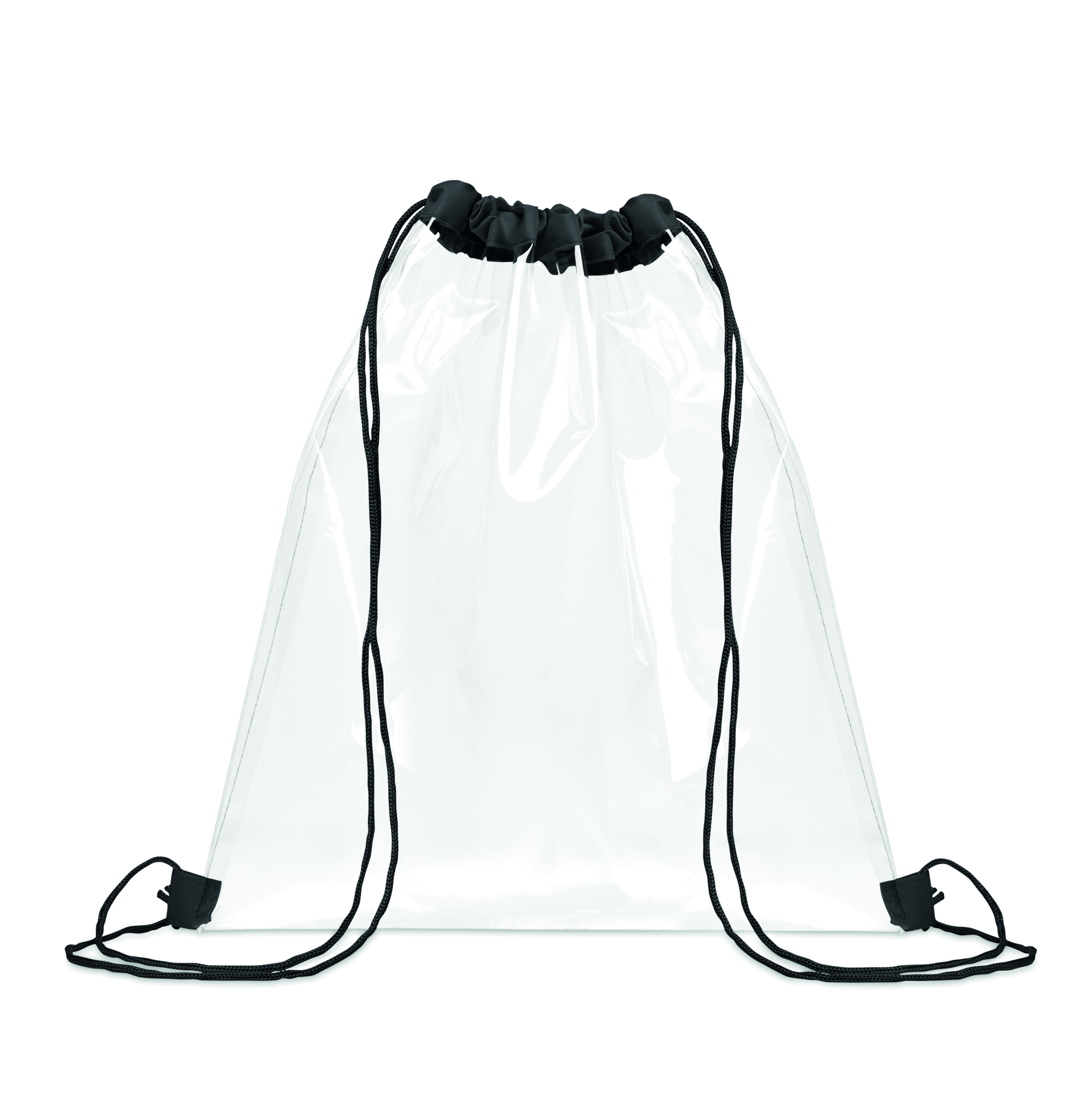 Transparent drawstring bag in EVA and PVC. Polyester cords.
