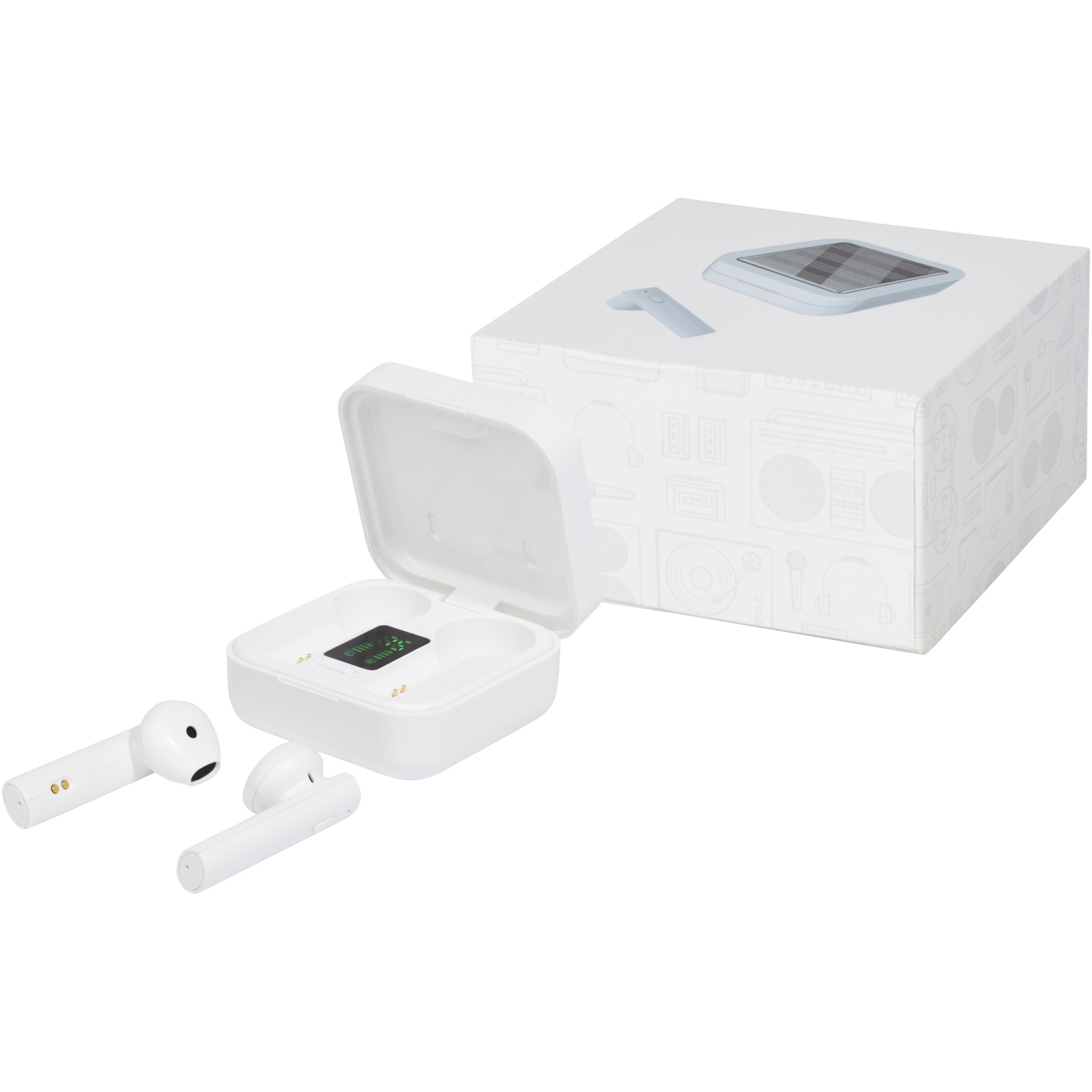 Стильные TWS-наушники (True Wireless Stereo) с эффективной солнечной панелью, встроенной в зарядный чехол. Идеальные наушники для активного отдыха, поскольку они могут заряжаться от солнечной энергии, когда источники питания недоступны. Bluetooth® 5.0 обеспечивает надежное соединение, низкое энергопотребление и радиус действия до 10 метров. Время воспроизведения — до 3 часов при максимальной громкости. Перезаряжаемая полимерная батарея (200 мАч) в зарядном футляре может заряжать наушники от 0 до 100% до 3 раз. Эргономичный дизайн и удобство ношения, со встроенной многофункциональной кнопкой на наушнике для быстрого управления. Поставляется в премиальной подарочной коробке.