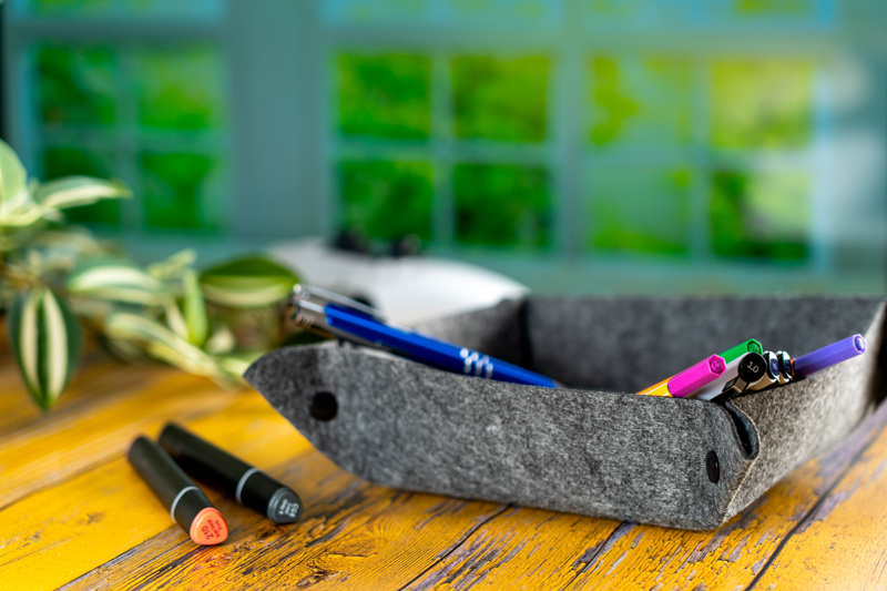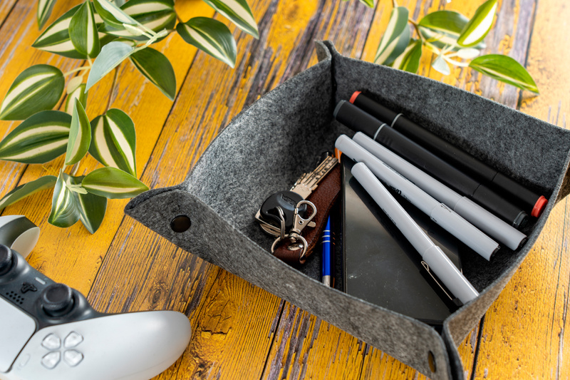 Миска для хранения из переработанного войлока. Благодаря практичным застежкам-кнопкам миску можно быстро убрать или поставить на место. Размеры сложенной миски 15 x 15 см.