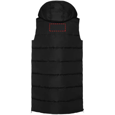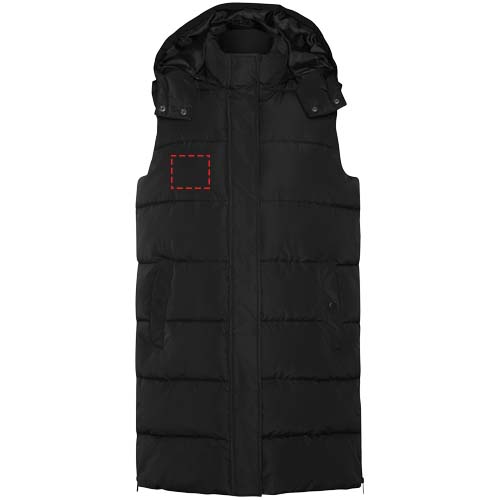 Мягкий утеплитель со съемным капюшоном. Высокий воротник. Передняя застежка-молния скрыта заслонкой. Два кармана с застежкой на кнопку. Боковые отверстия на молниях. Внутренний доступ к груди. Водоотталкивающая.