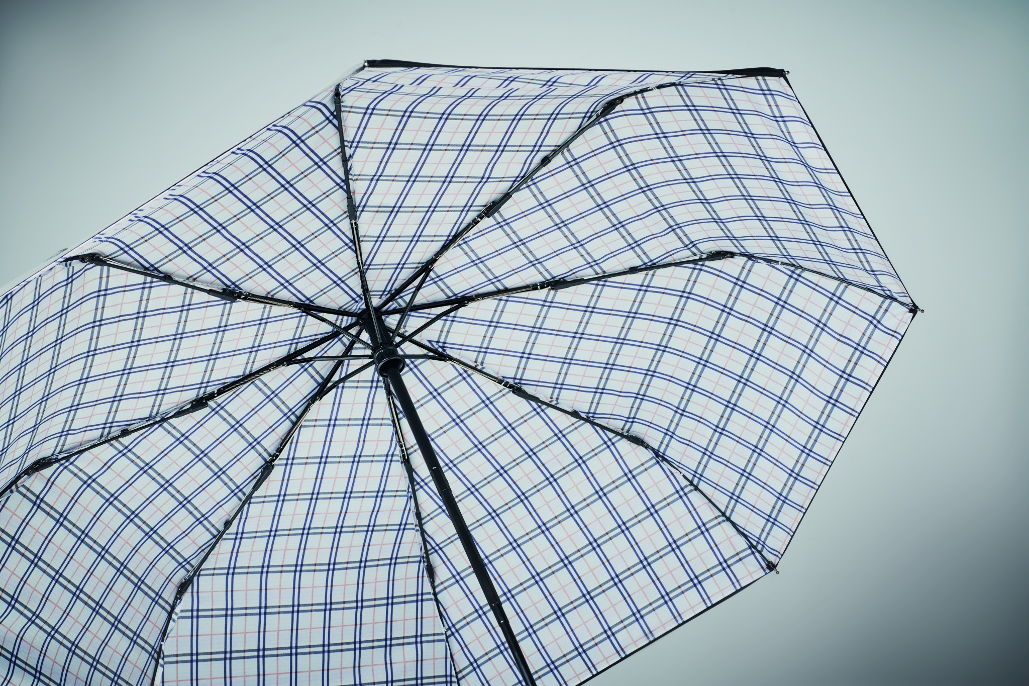 Ветроустойчивый зонт автомат, 23 дюйма в 3 сложения из двухслойного эпонжа 190T с рисунком в клетку. Каркас и стержень с черным покрытием. Двухсекционная средняя часть из черного стекловолокна с никелевым покрытием. Изогнутая прорезиненная ручка из пластика.