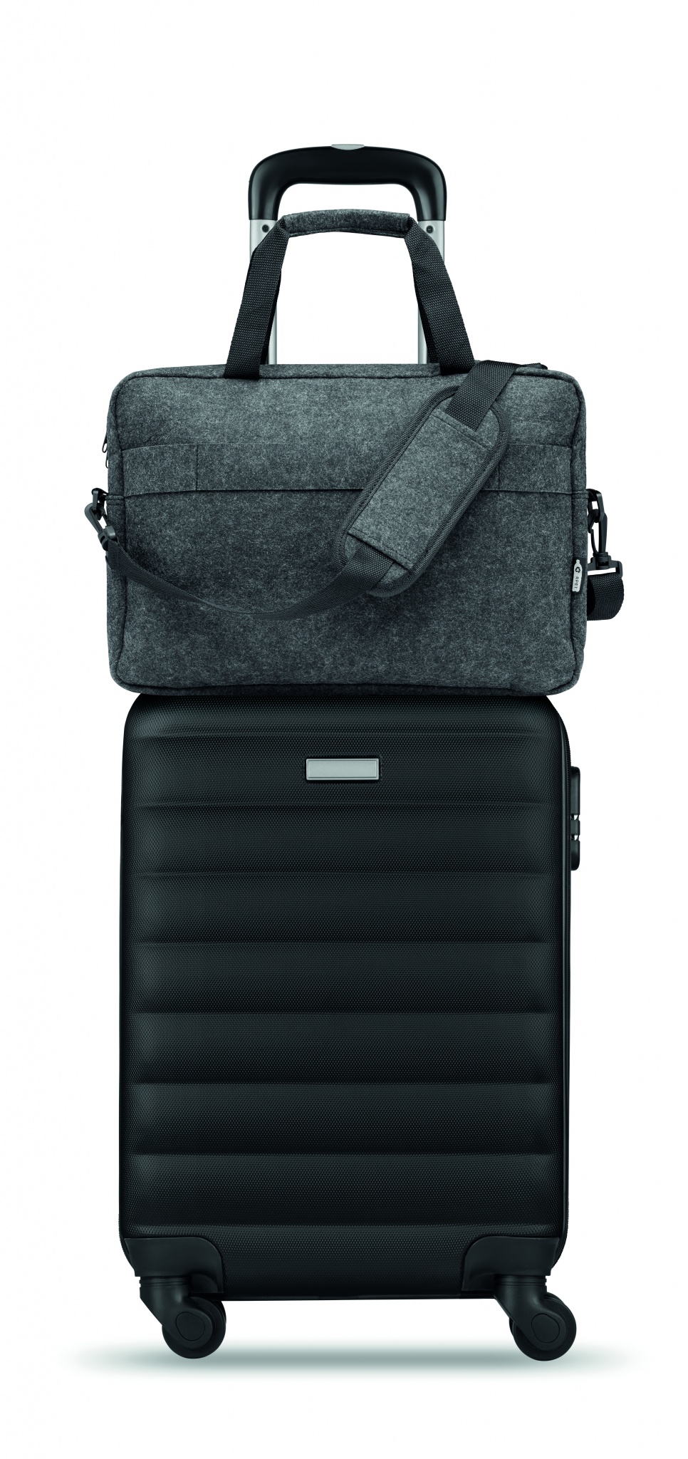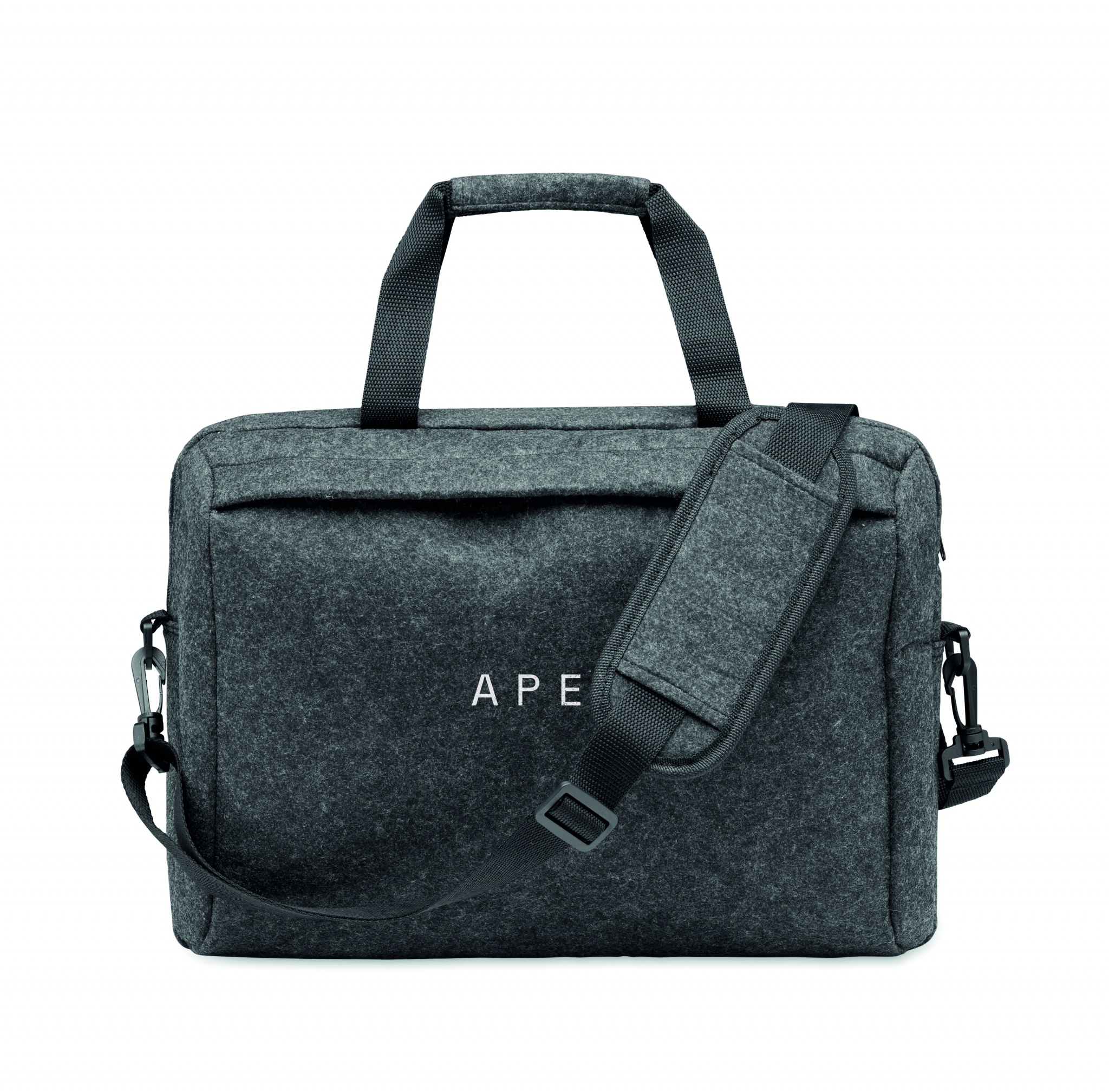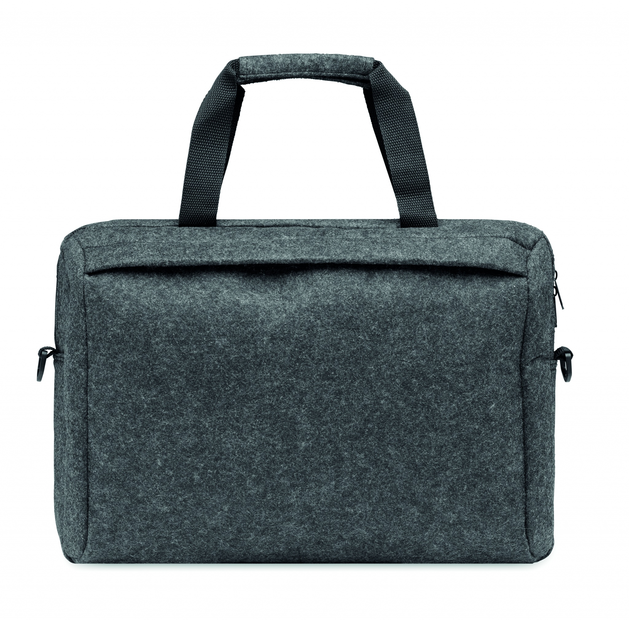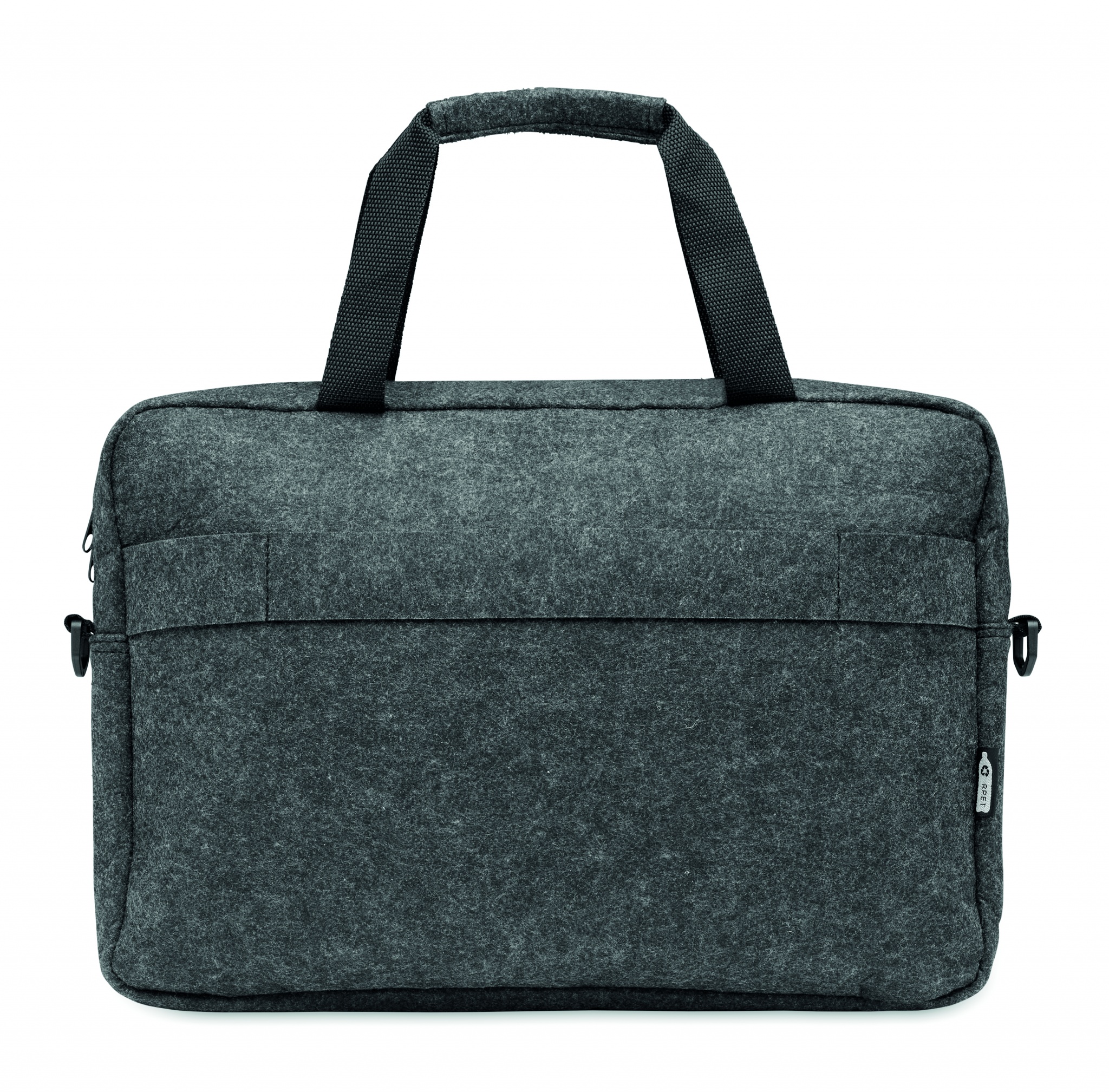 15-tums laptopväska i RPET-filt med ett invändigt huvudfack och en framficka med dragkedja. Med avtagbar och justerbar axelrem. Hållare för transportvagn på baksidan.