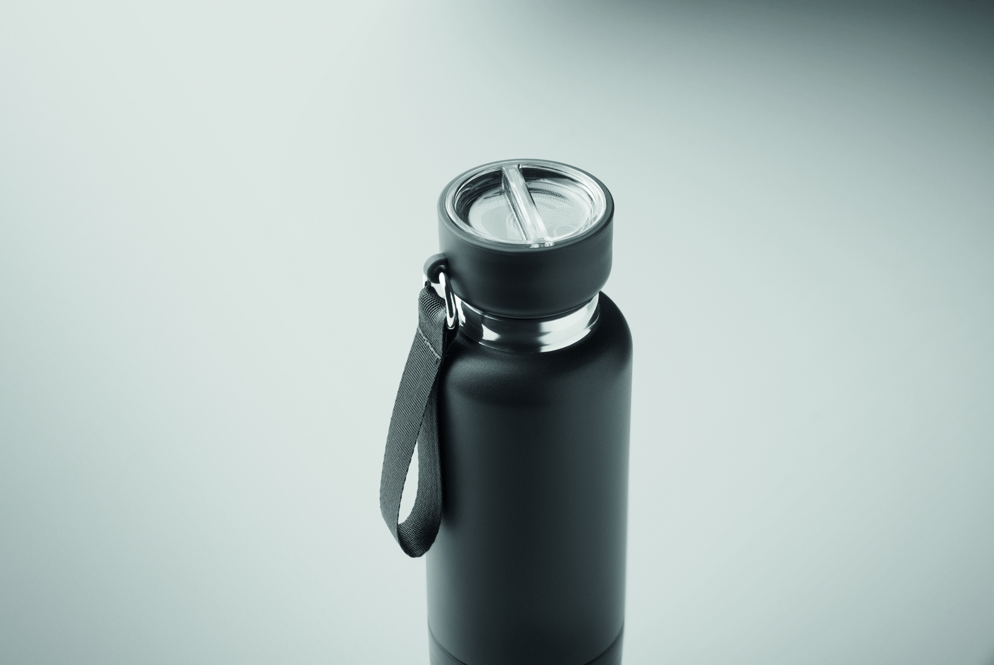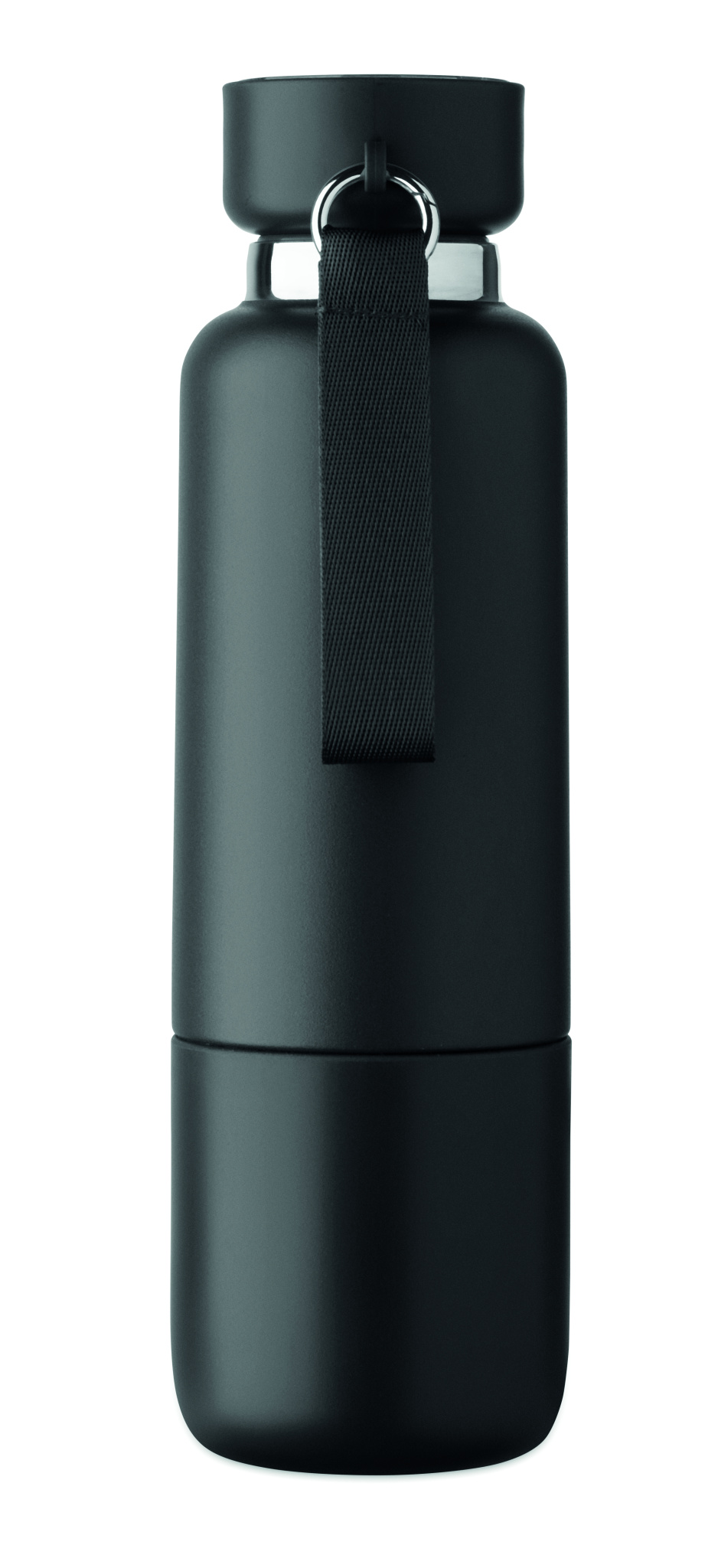 Dubbelväggig isolerad flaska i 90% återvunnet rostfritt stål och 10% rostfritt stål, med integrerat remhandtag och extra lång rem (70 cm) i PP-lock. Läckagefri. Bottenmugg ingår. Volym: 500 ml.