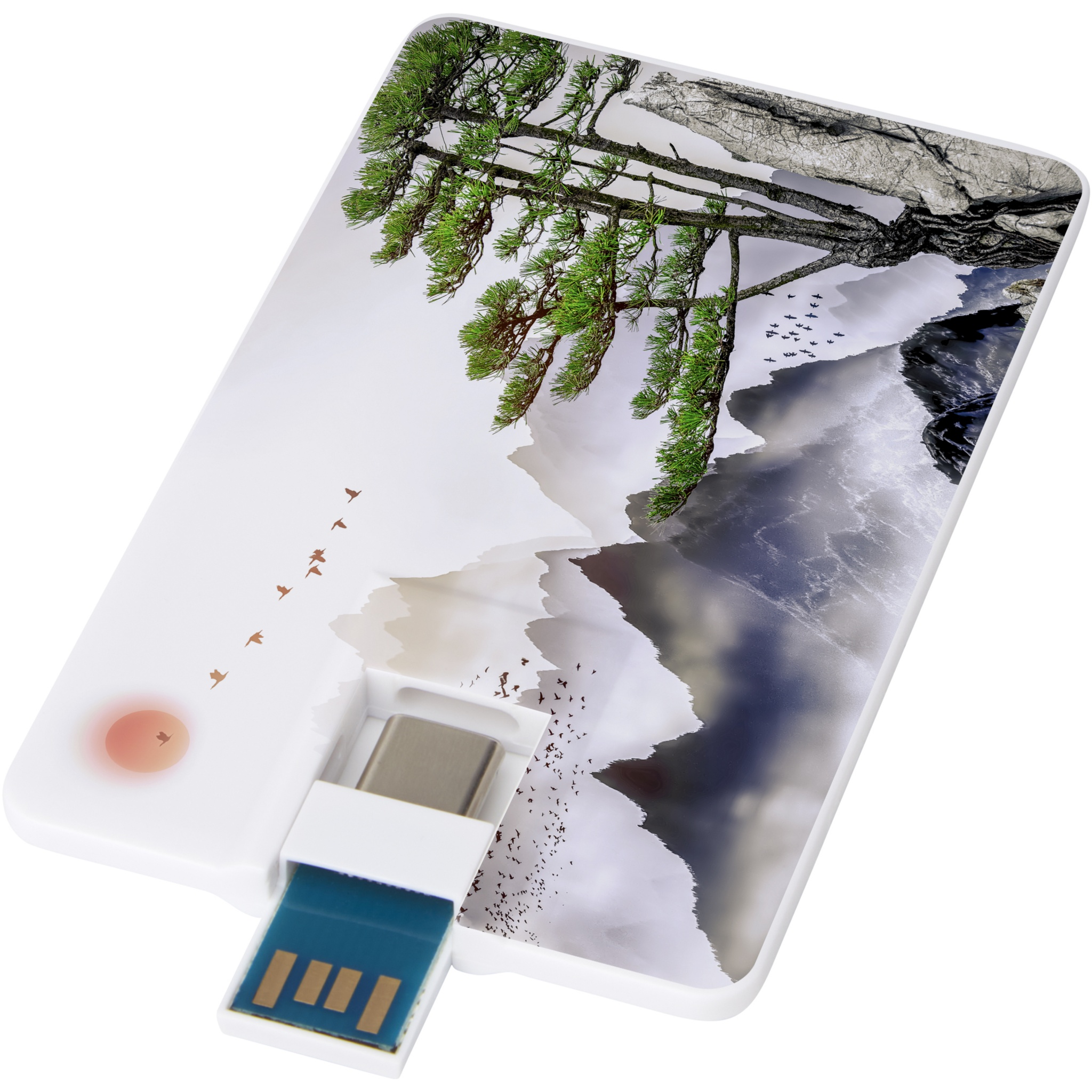 Next GEN 32 GB roterbar USB som erbjuder dubbla portar (Type-C och USB-A). USB-versionen är 3.0 med en skrivhastighet på 9 MB/s och en läshastighet på 20 MB/s. Den levereras i ett kuvert.