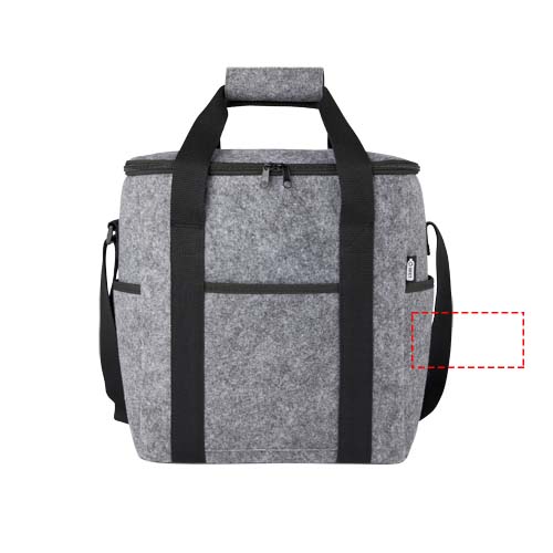 Stor kylväska tillverkad av högkvalitativ, mjuk och hållbar GRS-certifierad återvunnen filt. Har ett stort huvudfack (för sex 1,5-litersflaskor) fodrat med livsmedelssäker och extra tjock PEVA-isolering med hög densitet som håller drycker och förfriskningar kalla i timmar. Övre blixtlåsstängning, ficka framtill och två sidfickor för extra förvaring. Justerbara långa vävda axelband i bomull (55 x 3,8 cm) och två vävda bärhandtag i bomull (25 x 3,8 cm) med kardborreknäppning upptill. Lätt att rengöra. Kapacitet: 21 liter.