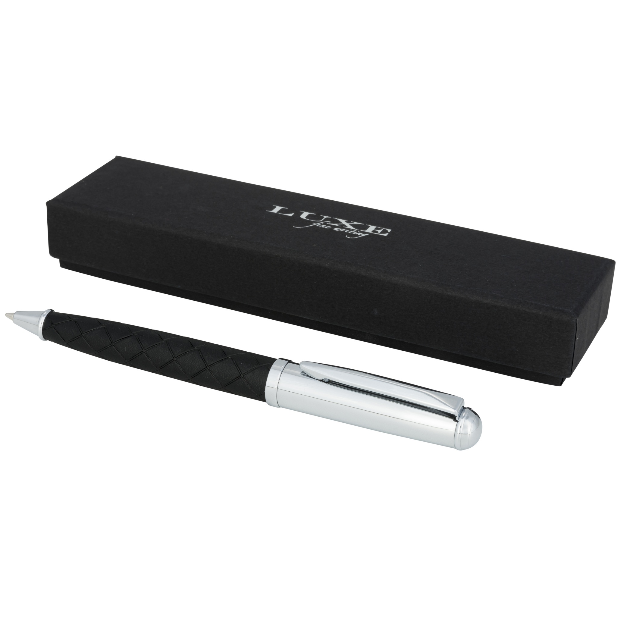 Fidelio kulspetspenna. Exklusivt designad kulspetspenna med ett korslinjemönstrat och läderinsvept grepp. Inkl. premium svart påfyllning och förpackad i en "LUXE" presentförpackning (16x4.5x2.5 cm). Metall och läderimitation.