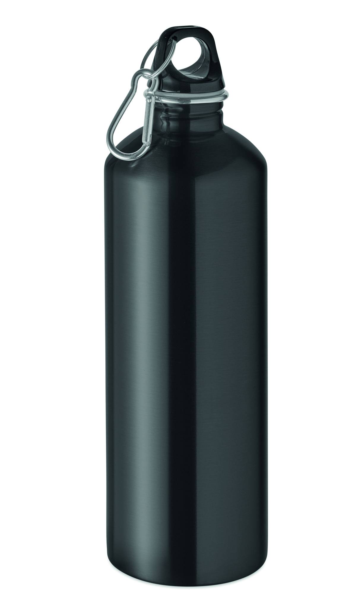 Enkelväggig flaska (90% återvunnet rostfritt stål och 10% rostfritt stål) med PP-lock och karbinhake. Volym 1000 ml. Eftersom detta är en enkelväggig flaska kan värmeöverföring fortfarande förekomma.