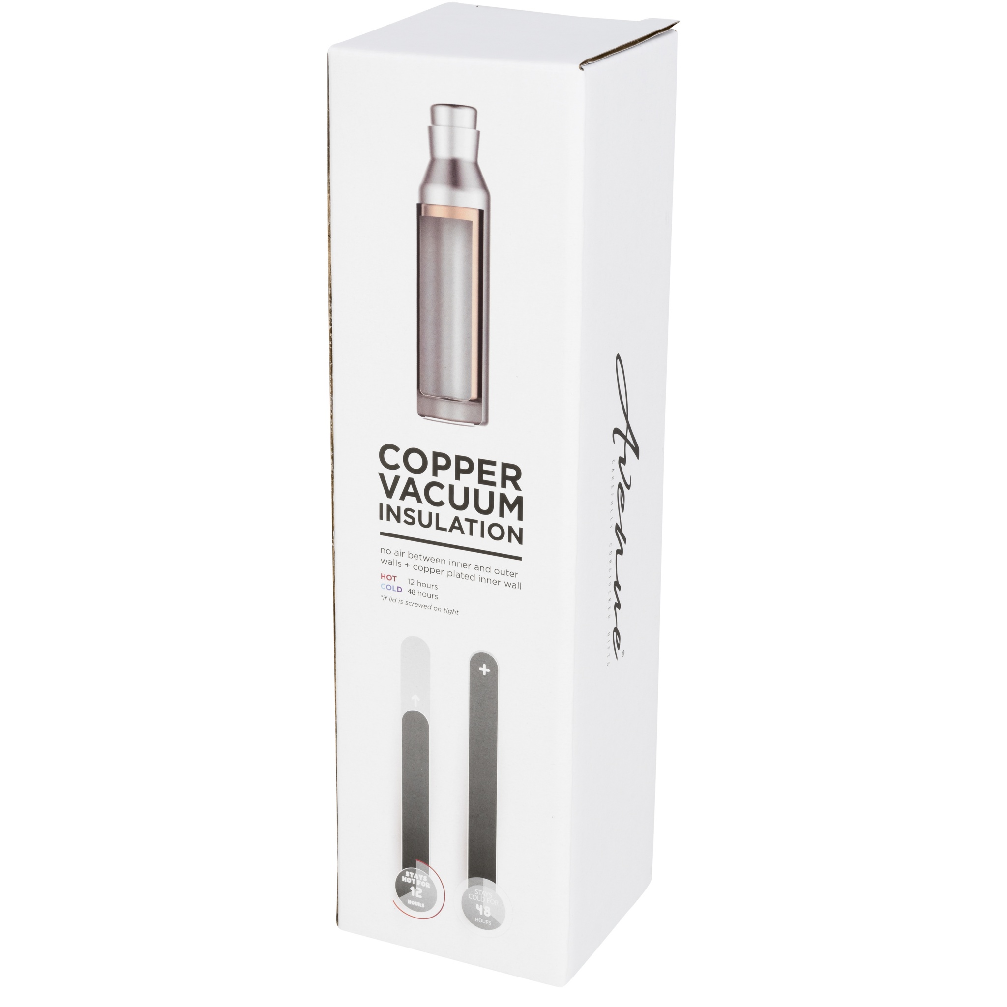 Fornnordiska vakuumisolerad flaska i koppar med kork. Tålig, dubbelväggad, rostfri vakuumkonstruktion med kopparisolering, vilket håller din dryck varm i 12 timmar och kall i 48 timmar. Konstruktionen förhindrar också kondens på utsidan av flaskan och locket är läckagesäkert. Flaska med innovativ design med korkskruvslock. Passar de flesta standard bilmugghållare. Volymkapacitet 590ml. Levereras i en presentförpackning av Avenue. Rostfritt stål.