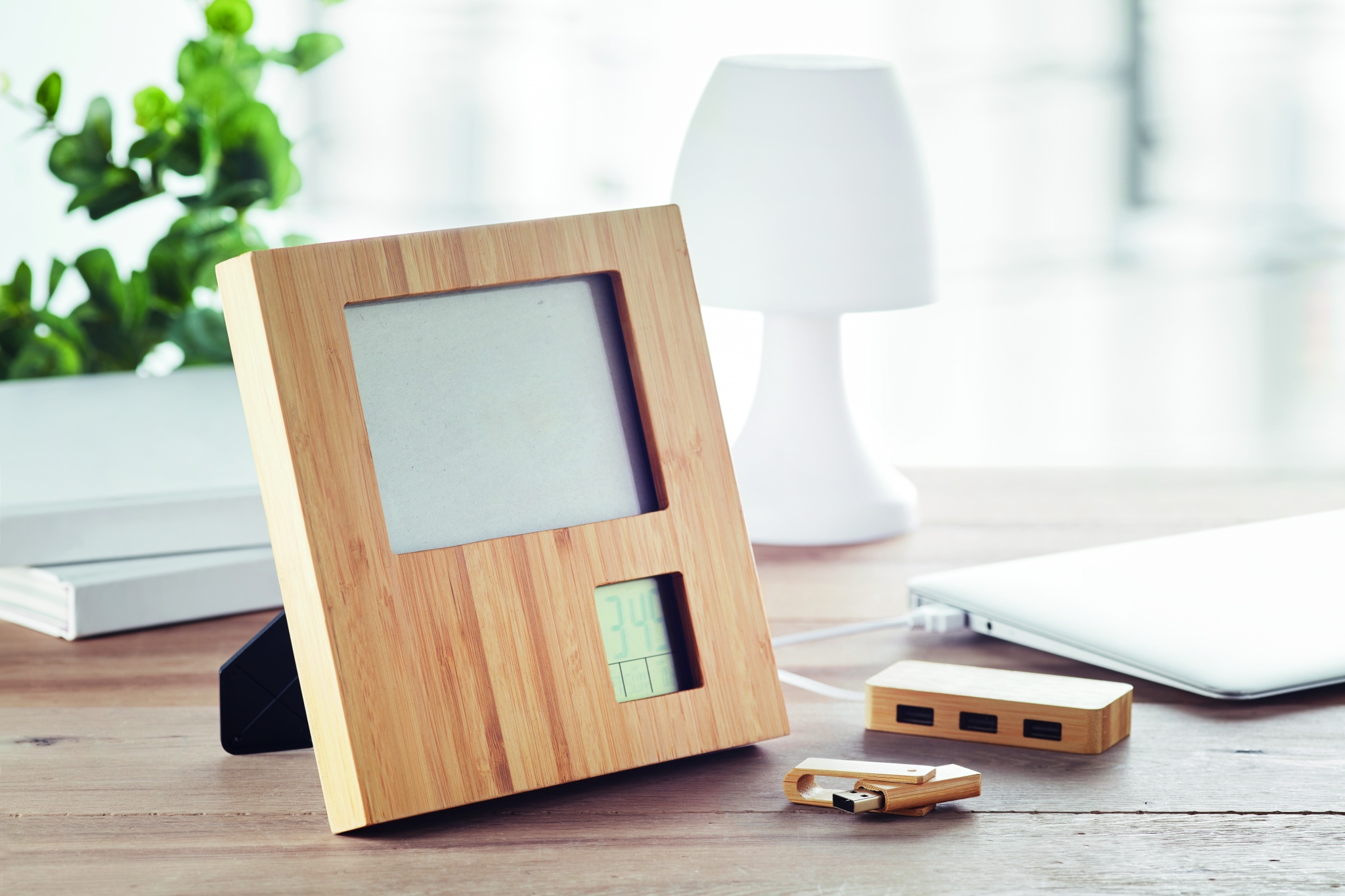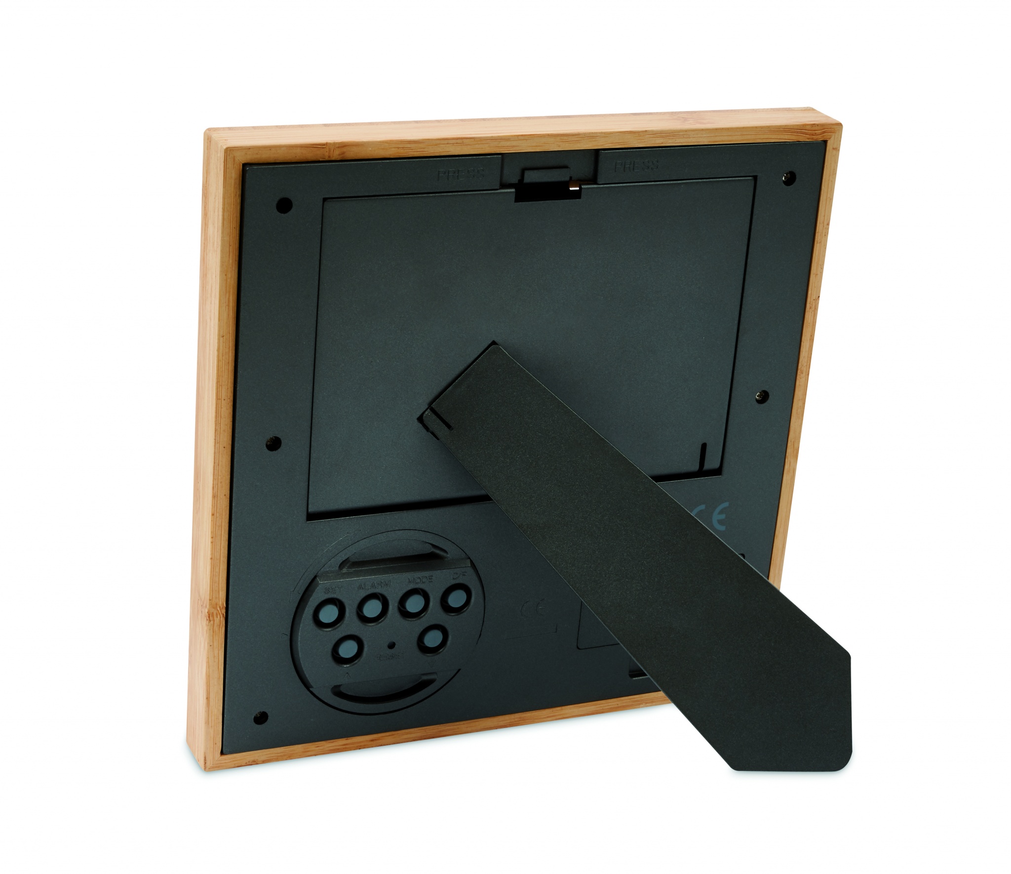 Fotoram i bambu med väderstation. Visar tid, datum och temperatur. Alarmfunktion och timer. Drivs av 2 st AAA batterier som ej ingår men kan köpas till, se art.nr KC1806-99. Eftersom bambu är ett naturligt material kan vissa färgskiftningar förekomma.
