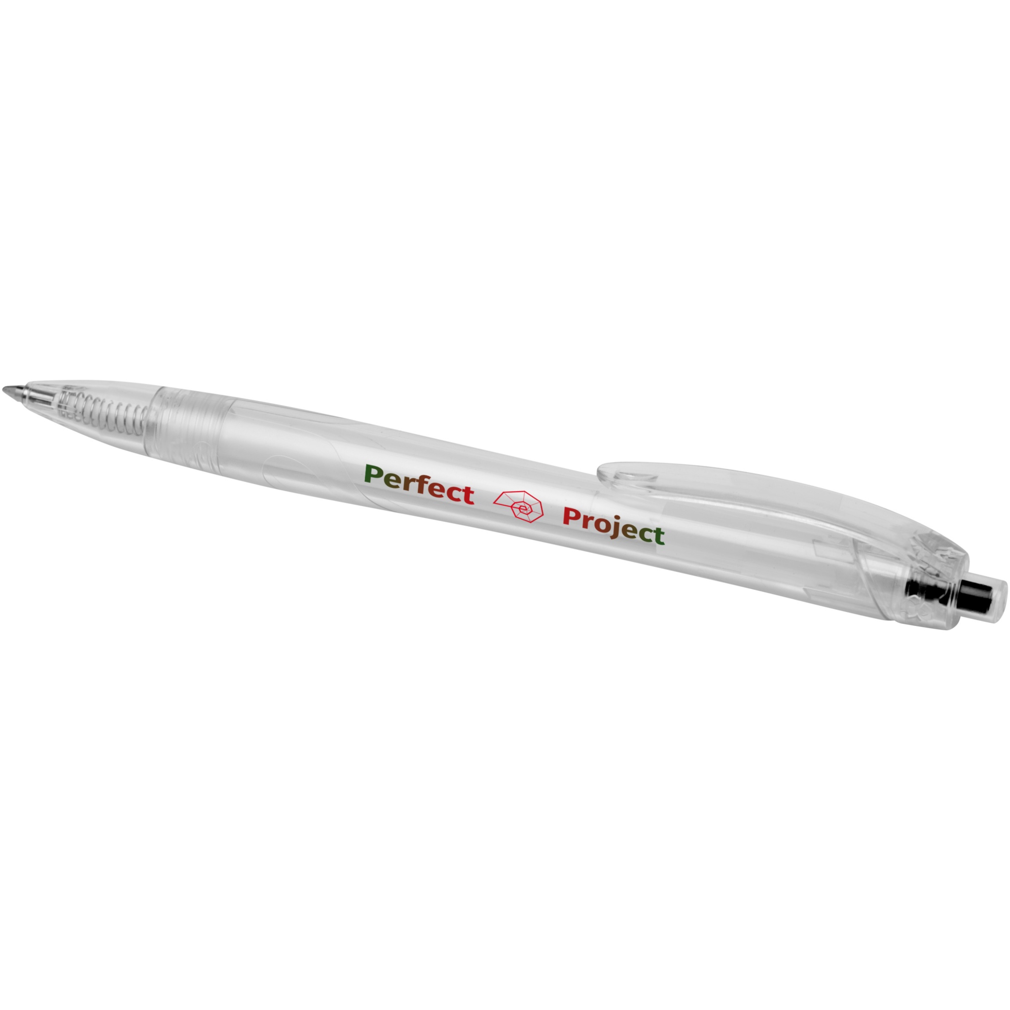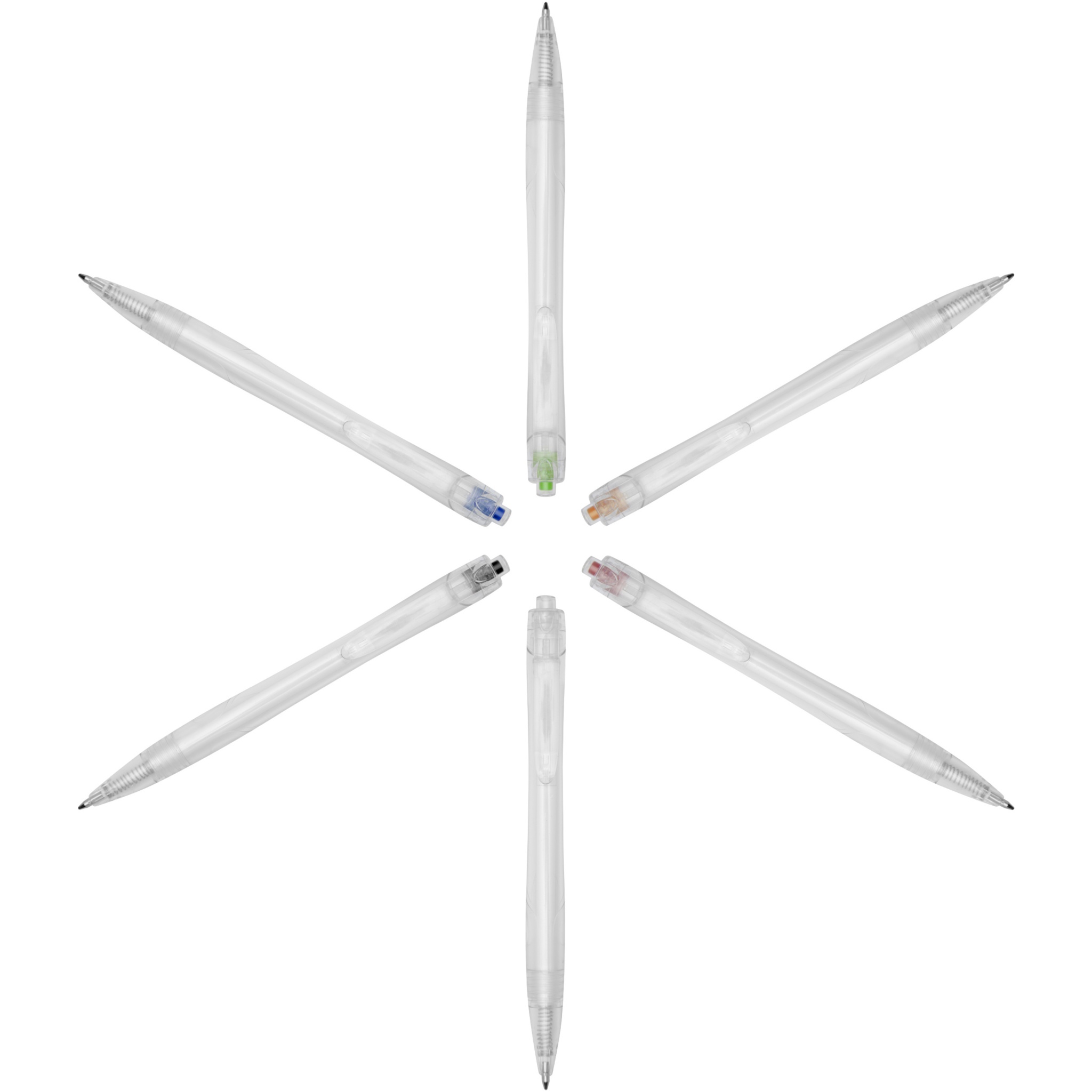 Click action kulspetspenna gjord av återvunnen PET-plast, vilket bidrar till att minska användningen av ny plast. Kulspetspennan levereras med en transparent pennkropp och färgad tryckknapp. Den är förladdad med en blå påfyllning och kan kombineras med 107763 Honua RPET notebook.