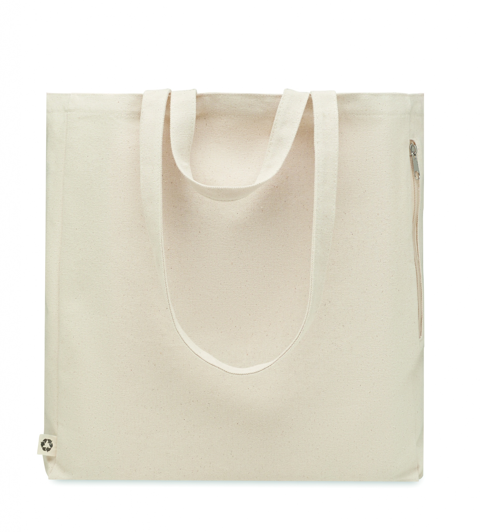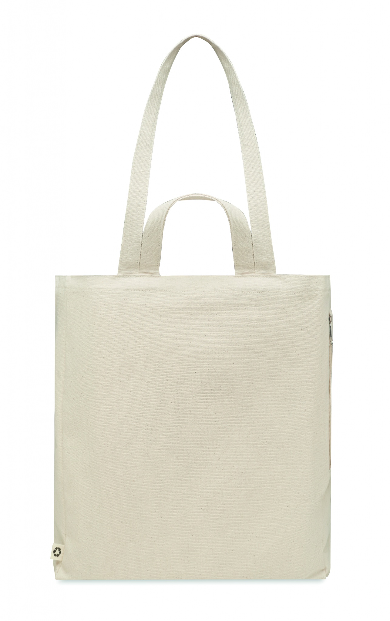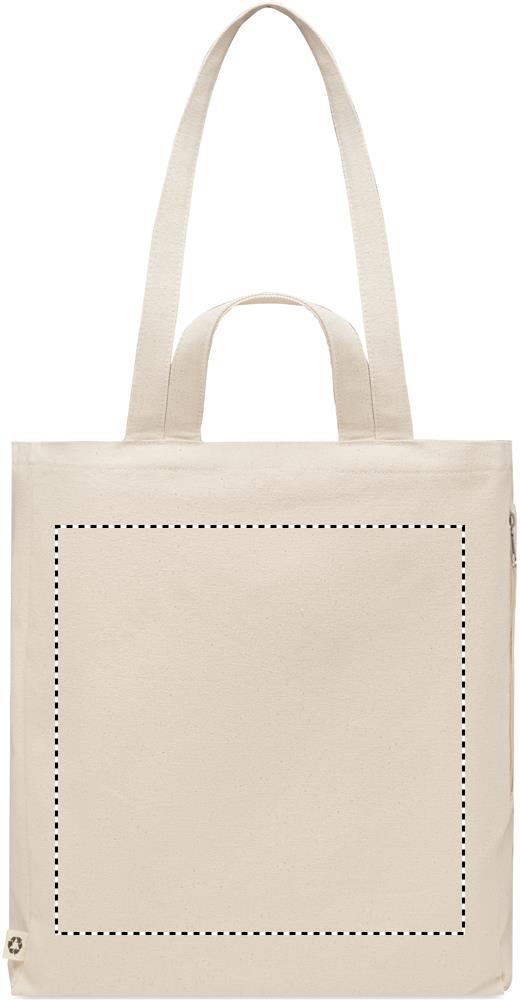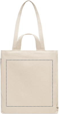 Tygkasse eller strandväska av återvunnen polycotton (70 % återvunnen bomull, 30 % återvunnen polyester) med korta handtag. Den har en sidoficka med dragkedja.380 gr/m².