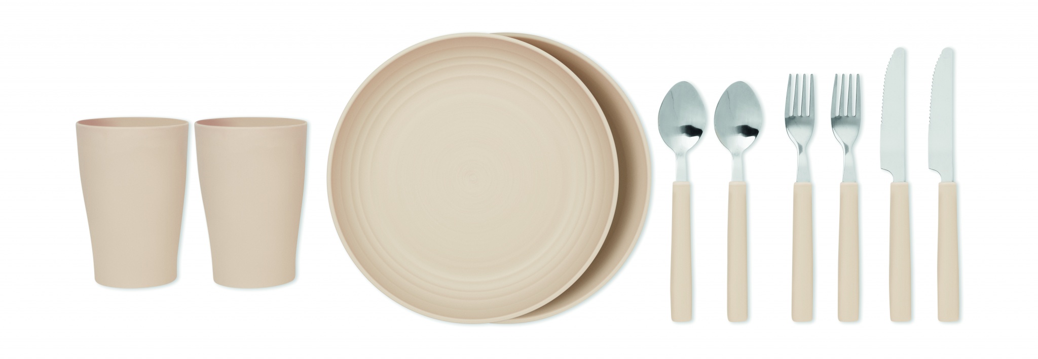 Kylväska utformad som picknick ryggsäck i 2-färgad 600D RPET med tillbehör för 2 personer. Innehåller rostfri kniv och gaffel, sked och kopp i blandninga av 70% vetehalm och 30% PP.