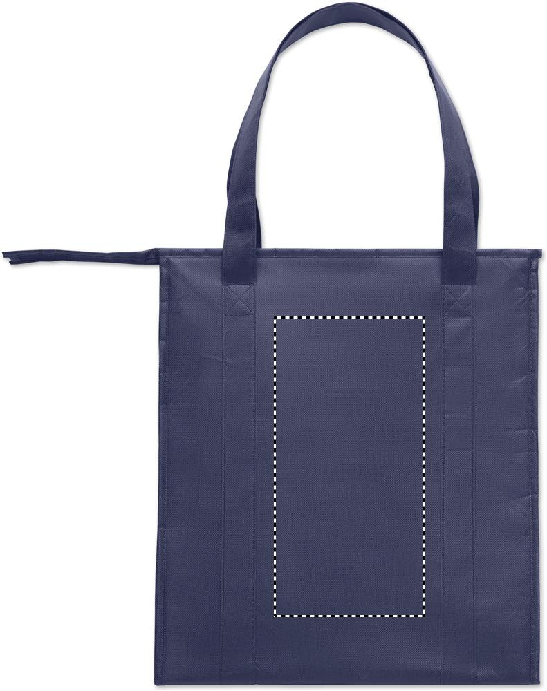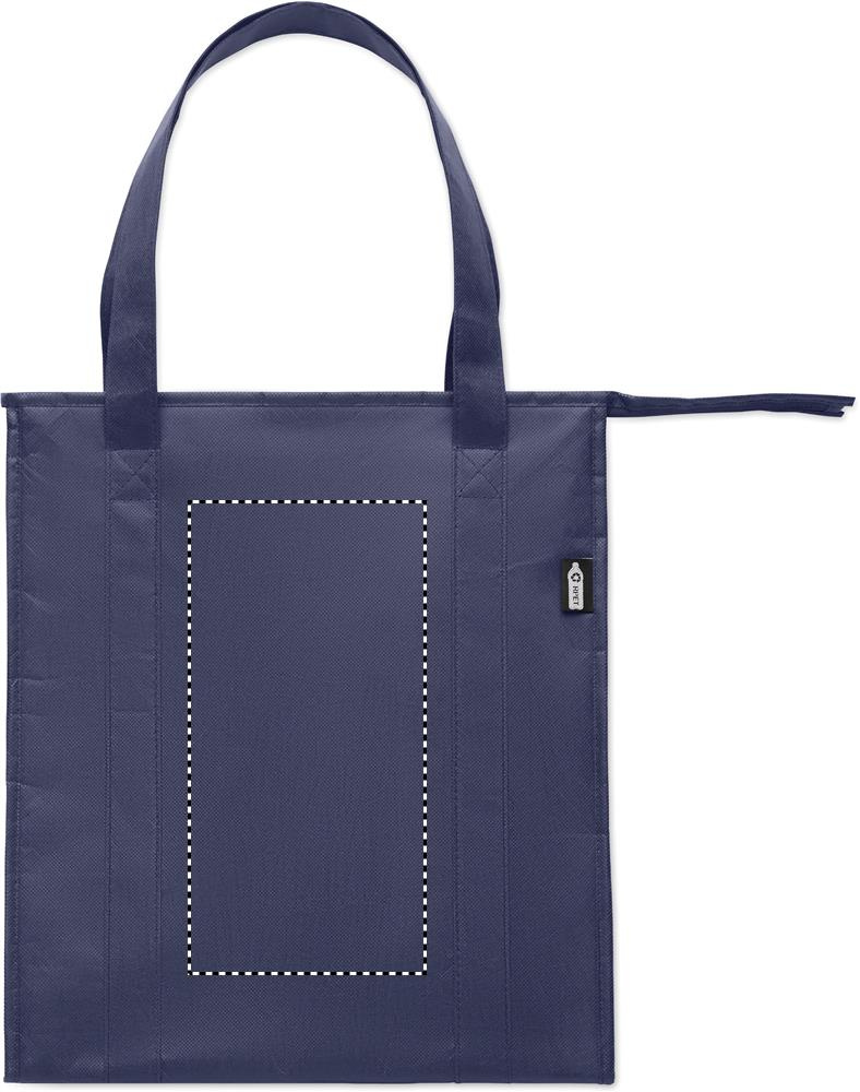 Kylväska/kasse i RPET nonwoven 80gr/m². Isoleringsmaterial: aluminiumfolie. Volym 25 liter. Huvudfack med dragkedja på ovansidan med löstagbar botten i PP.
