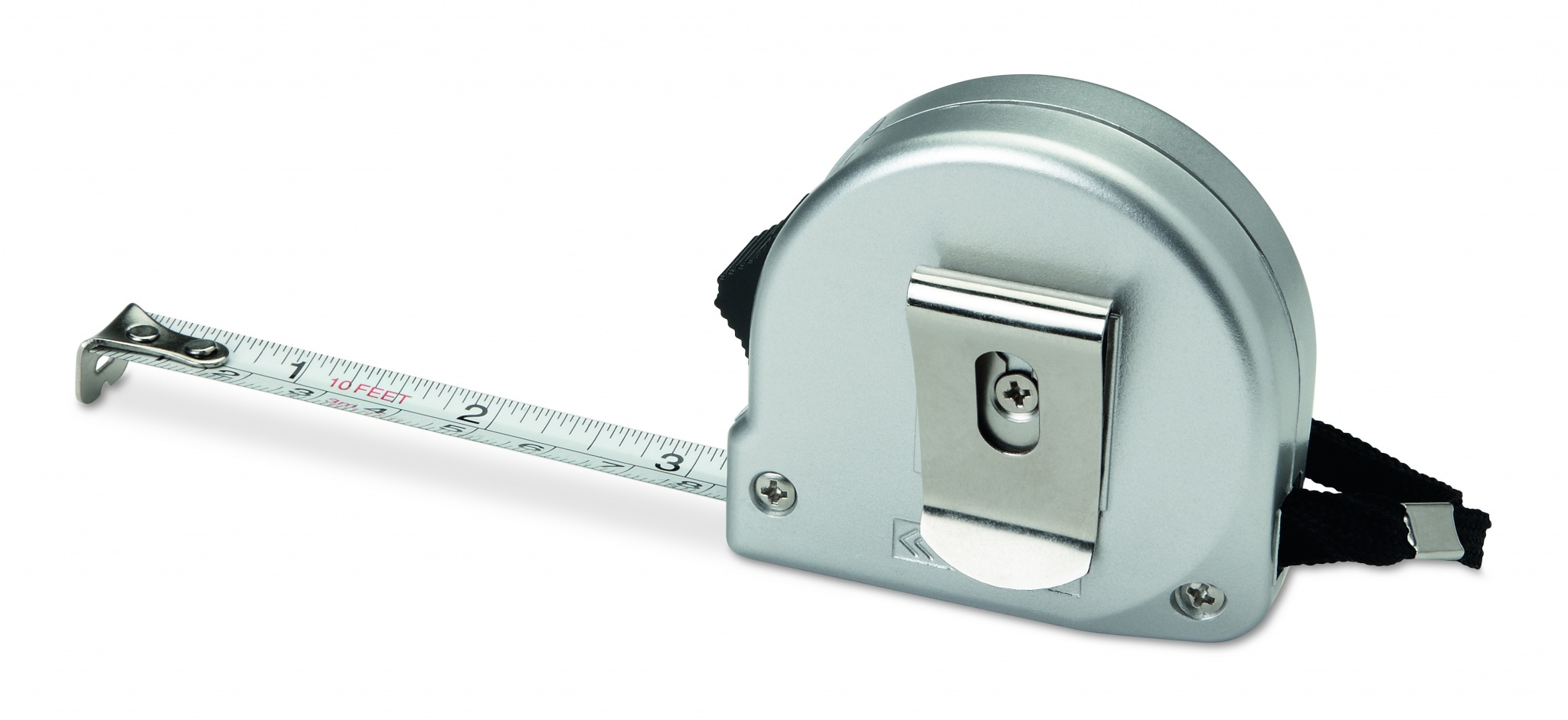 Måttband, 2 meter i silverfärgat case i ABS plast. Handledsband och praktiskt clips.