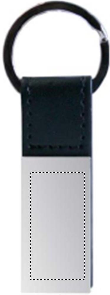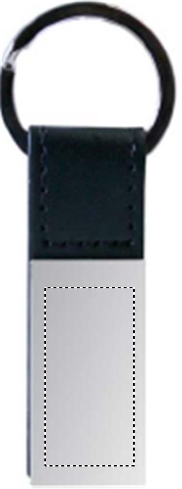 Nyckelring utav PU material med en kvadratisk platta av metall.