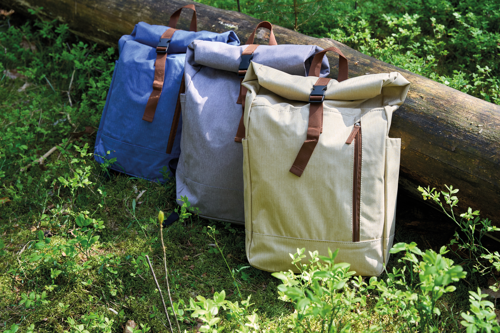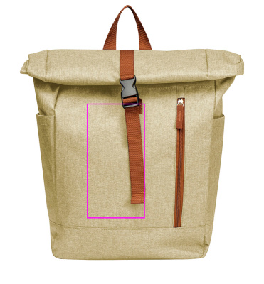 Ryggsäck av 500D polyester med vikbar eller rullbar stängning, vadderade remmar, bärhandtag och låsbart frontfack. Din logotyp kommer att tryckas på det främre facket.