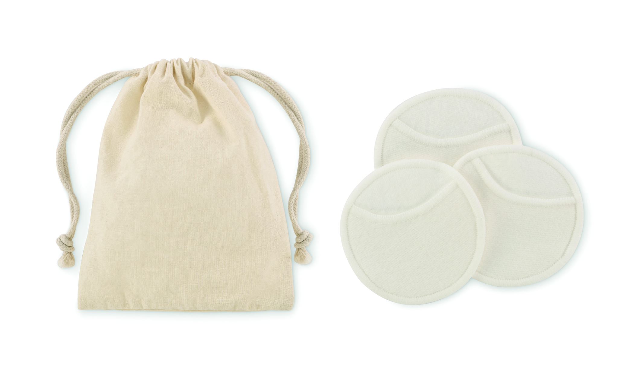 3 stycken återanvändbara och tvättbara mjuka ansiktslappar (diameter 8 cm) tillverkade av 70% bambufiber och 30% bomull i bomullspåse.