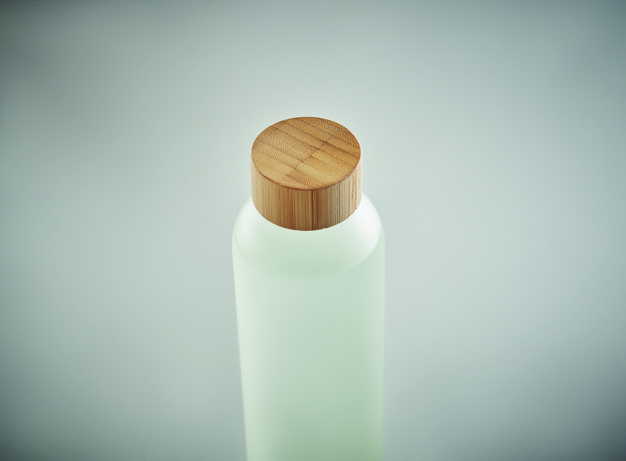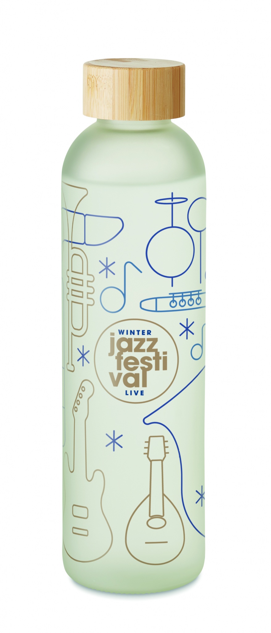 Glasflaska med specialbeläggning för sublimering och lock av bambu. Kapacitet: 650 ml.
