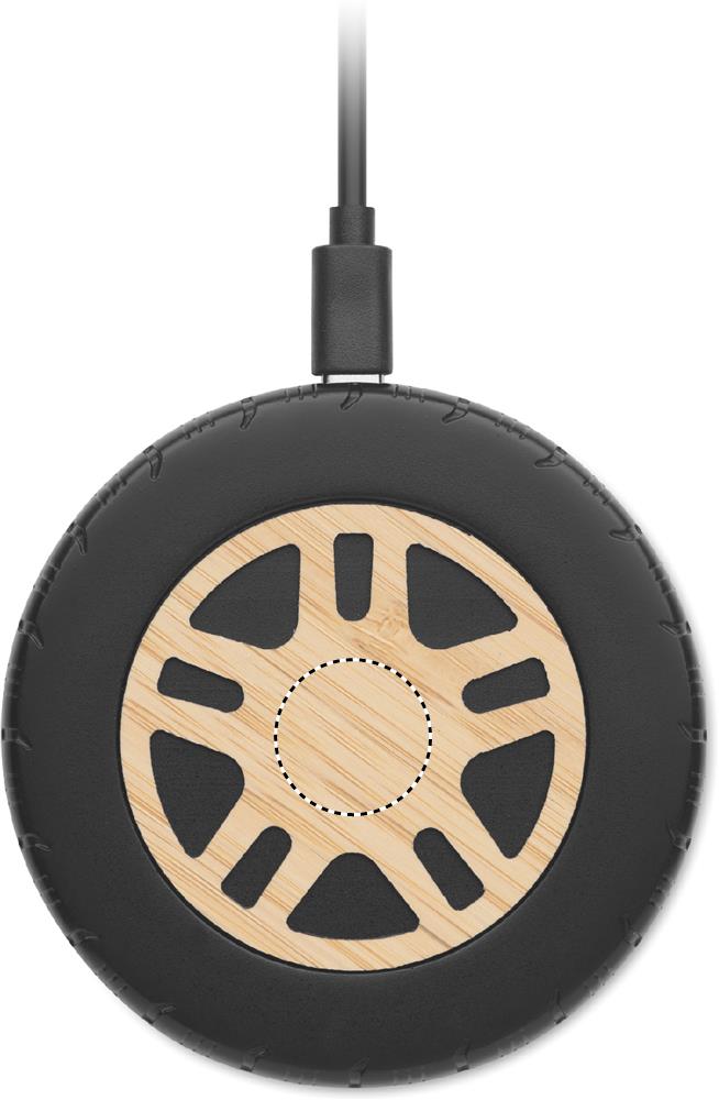 Trådlös laddare 15W i återvunnen ABS med topp i bambu. Design som ett bilhjul. Anslut enheten till din dator, placera din smartphone på den och låt den laddas. Utgång: DC 9V/1,10A (15W) för snabbladdning. Kompatibel med de senaste androiderna, iPhone® 12, X och nyare.