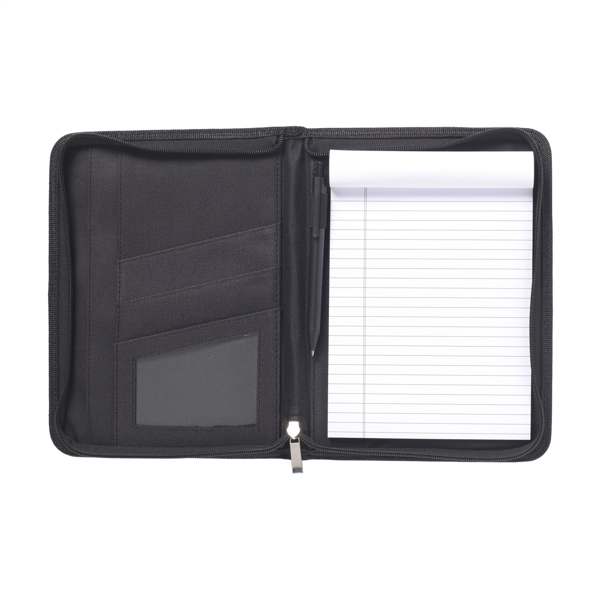 Konferens-/dokumentmapp tillverkad av fint bonded läder, i A5-format. Med ett urval av fickor och dragkedja. Inkl. skrivblock och kulspetspenna. Varje artikel är individuellt förpackad.