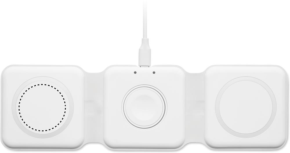 3 i 1 hopfällbar laddningsstation i ABS. Den har 3 trådlösa laddningspunkter. Ingång: 2-i-1 typ-C och typ-A. Kompatibel med alla QI-aktiverade enheter som senaste Android, iPhone® 8, X och nyare. Även kompatibel med iWatch.