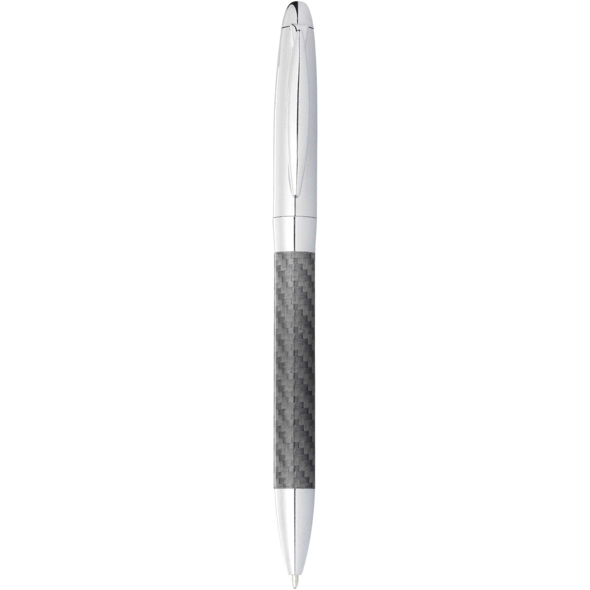 Kulspetspenna med vridmekanism i klassisk design med glänsande överdel och underdel med kolfiberdetaljer. Presentförpackning i form av en cylinder.